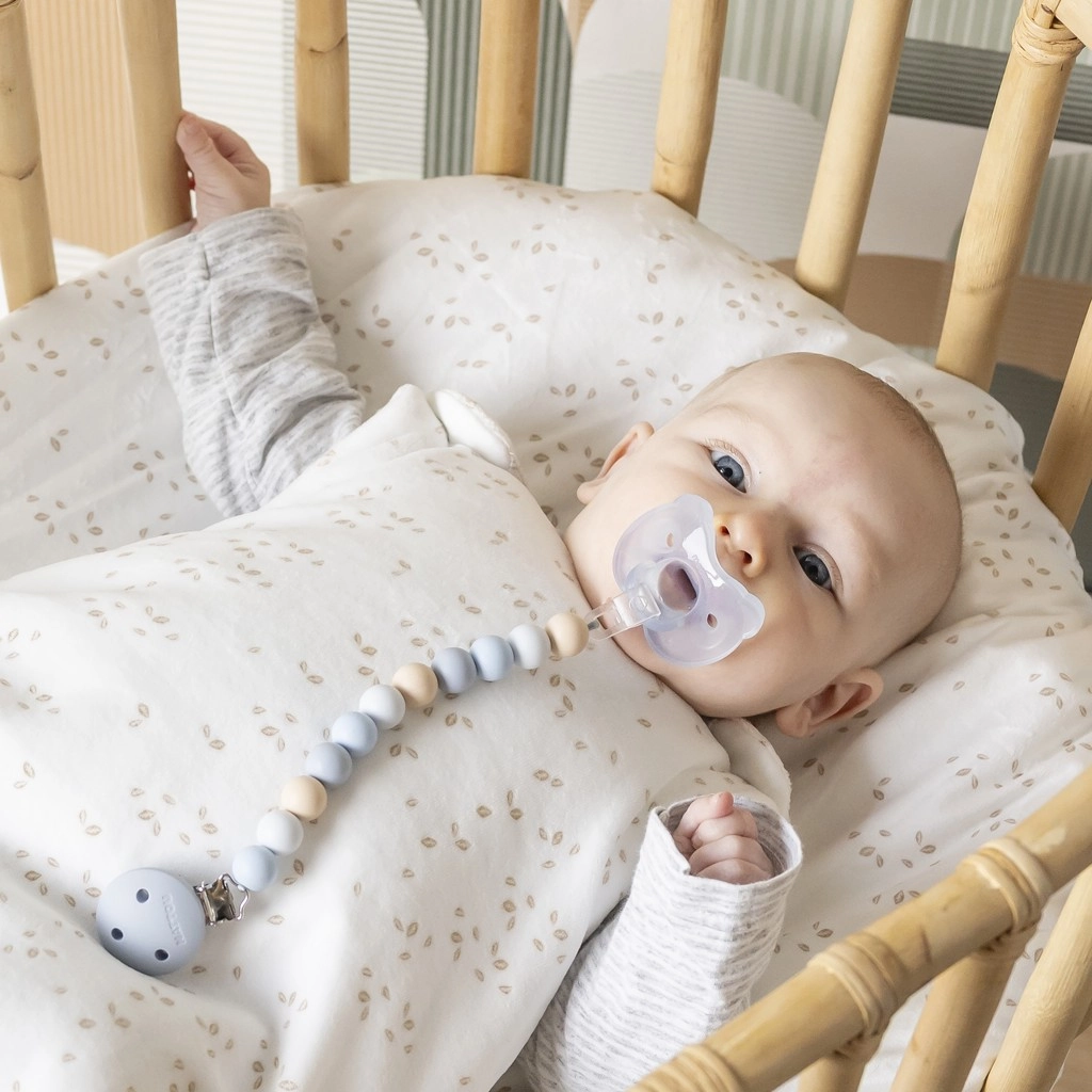 La pince en métal tient de manière fiable sur les vêtements ou les gigoteuses, ainsi la tétine reste propre et toujours accessible – à la maison comme en promenade.