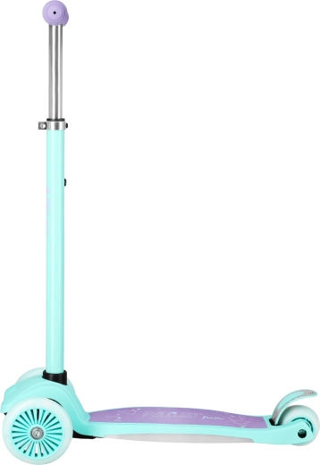 La commande est intuitive grâce à la direction par transfert de poids : en inclinant le guidon, les roues avant tournent dans la direction souhaitée. Le guidon réglable en hauteur (78 / 84 / 90 cm) et les poignées TPR confortables permettent à la trottinette d’évoluer avec l’enfant. La construction en aluminium, acier et nylon est très légère (2,46 kg) et en même temps résistante, avec une charge maximale allant jusqu’à 50 kg.