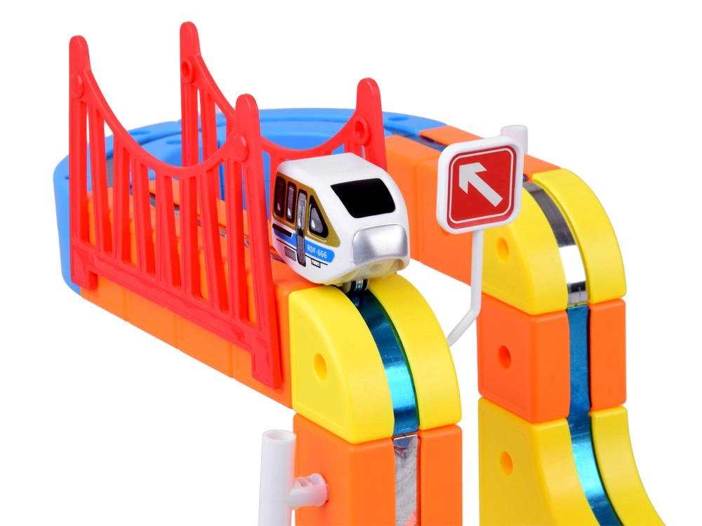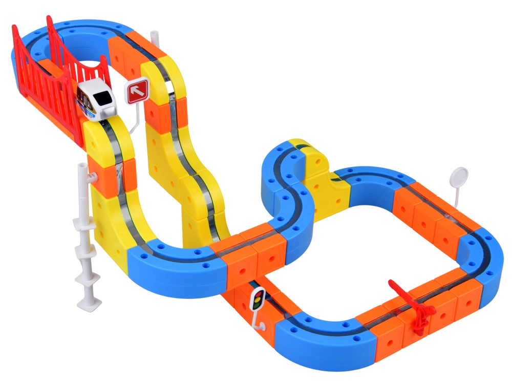 Le circuit modulaire magnétique offre aux enfants une expérience de conduite unique – le véhicule magnétique reste sur les rails même retourné et traverse en douceur les ponts, virages et rampes. Grâce aux connecteurs magnétiques, vous construisez des structures stables en un rien de temps, que ce soit au sol, sur une table ou à l’aide de ventouses au mur.
