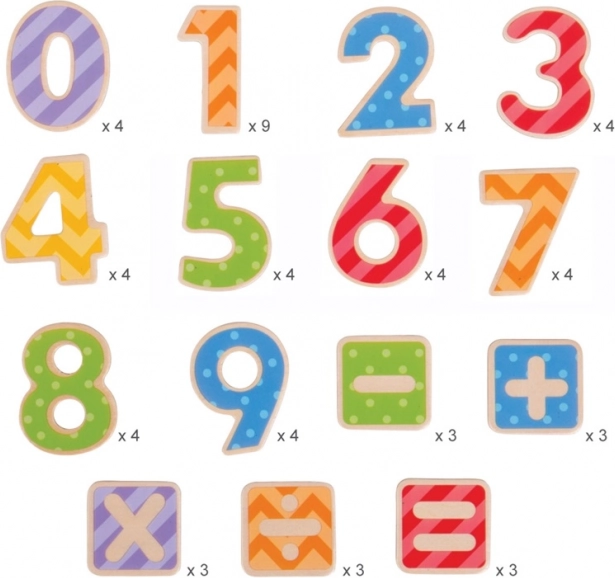 Le set comprend au total 56 pièces magnétiques, incluant des chiffres et des symboles mathématiques.