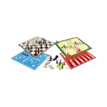 Le coffret comprend : 2 plateaux de jeu recto verso (4 surfaces de jeu), 32 pièces d’échecs en deux couleurs, 16 pions en quatre couleurs, 30 pions de dame en deux couleurs, 6 dés à points, 1 notice.