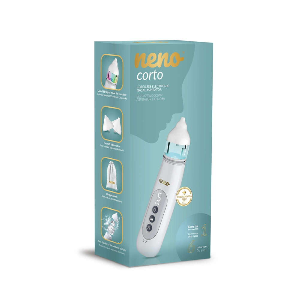 Neno Corto est un aspirateur nasal sans fil compact conçu pour les nourrissons et les tout‑petits dès les premiers jours de vie. Il élimine le mucus en douceur et efficacement sans irriter la muqueuse nasale sensible. Un écran clair, une utilisation simple et 5 niveaux de puissance d’aspiration permettent d’adapter la performance à l’âge et aux besoins du moment.