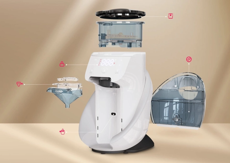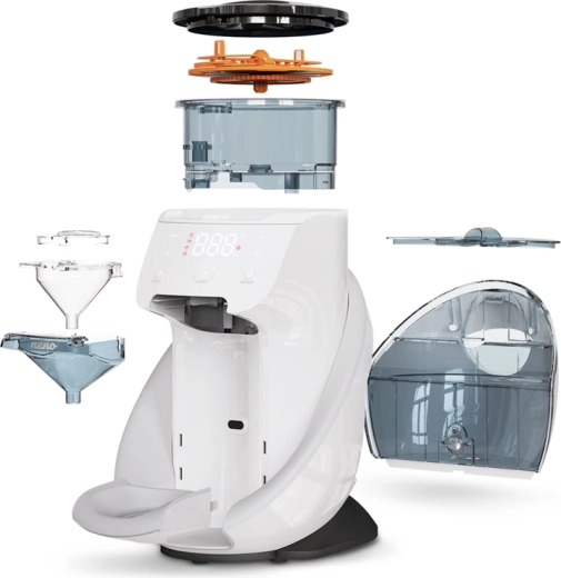 Le dosage, le chauffage et le mélange automatiques garantissent une consistance parfaitement lisse, sans grumeaux ni bulles – avec une température précise pour une alimentation en toute sécurité.