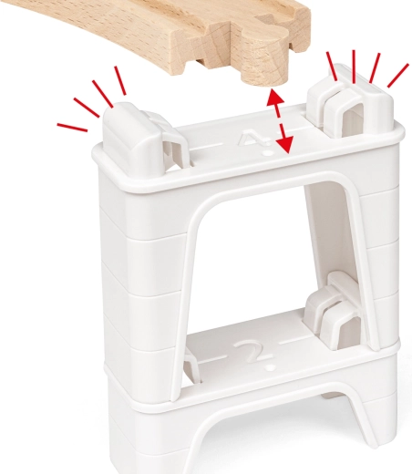 Construisez en hauteur grâce aux supports modulaires et à l’emblématique pont rouge BRIO. Une structure stable garantit une circulation fluide même avec des spirales élevées.