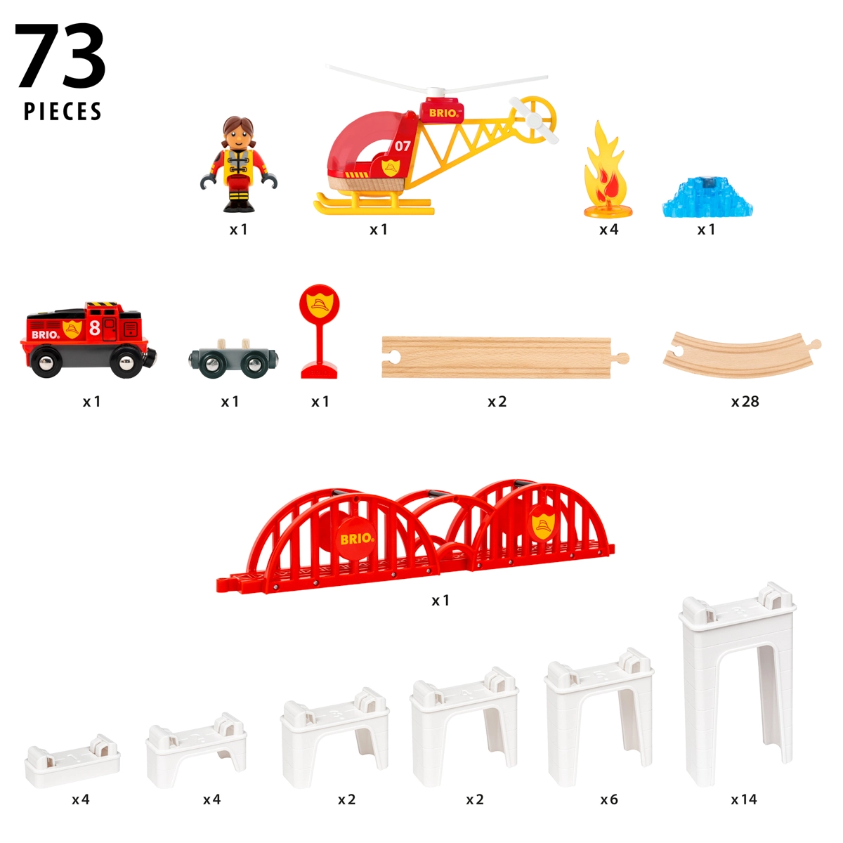 - 73 (32× supports modulaires, 30× rails en bois, 1× long pont rouge, 1× locomotive à batterie, 1× wagon de fret, 1× cargaison d’eau, 1× hélicoptère, 1× figurine de pompier, 4× accessoires de pompiers, 1× panneau de pompier)