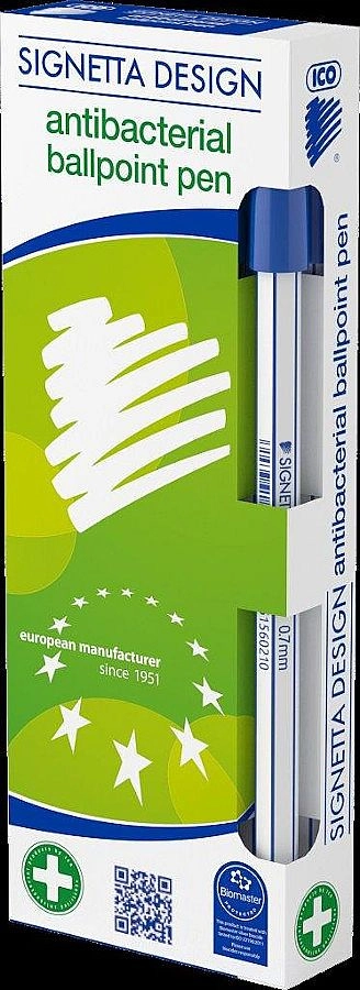 Le stylo bille antibactérien ICO Signetta est un choix idéal pour le bureau, l’école et les accueils, où il circule entre plusieurs utilisateurs. Un mélange spécial avec des nanoparticules d’argent est intégré directement dans le matériau du corps du stylo, ce qui limite la prolifération des bactéries à sa surface et aide à maintenir un niveau d’hygiène plus élevé lors d’une utilisation quotidienne.