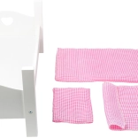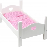 Ce charmant lit en bois, conçu pour des poupées ou peluches jusqu’à 45 cm, est un accessoire idéal pour toute salle de jeux d’enfant. Grâce à sa construction robuste et à ses détails délicats, comme les découpes en forme de cœur sur les têtes de lit, il assure un divertissement de qualité et durable. Le set pratique comprend un oreiller, une couverture et un drap au motif rose délicat, qui apporte une touche de réalisme au jeu. Le lit est fabriqué en bois de qualité, garantissant sécurité et résistance lors des activités ludiques.