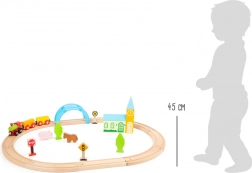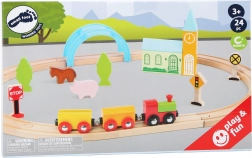 Le set comprend 24 pièces, dont un train magnétique avec wagons, des rails encliquetables en bois et des éléments décoratifs colorés. La fabrication robuste en bois est agréable au toucher, sûre et idéale pour les petites mains. Le jeu développe naturellement la motricité fine, la coordination œil–main et l’apprentissage des règles de circulation.