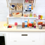 L’ensemble comprend du jus d’orange, deux pots de glace, un paquet de petits pois, des bâtonnets de poisson, du beurre, du fromage, du saucisson tranché et une brique de lait. Les impressions réalistes et l’apparence naturelle séduisent au premier regard. Grâce au bois robuste, l’ensemble est durable et prêt pour un usage quotidien.