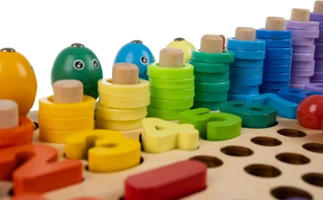 Le set comprend des modèles recto-verso, des chiffres, des symboles mathématiques, ainsi que des anneaux et des billes colorés pour construire des motifs. Grâce à sa base en bois, le jouet est résistant et stable, ses couleurs vives stimulent la créativité et l’enfant acquiert facilement les bases des mathématiques.