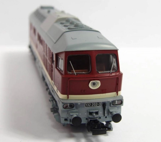 Modèle fidèle et détaillé de la locomotive diesel-électrique BR 132 « Ludmilla » en livrée DR. Il séduit notamment par des détails différenciant des autres variantes, tels que la rambarde sur la face avant, les détails des fenêtres frontales et latérales ainsi que la conception du toit. La peinture et les marquages, incluant tous les éléments décoratifs, sont de la plus haute qualité, conformes à la gamme Expert. Le modèle est équipé d’un moteur puissant doté de volants d’inertie ; le couple est transmis par des roues bandagées disposées en diagonale sur les essieux internes des bogies, tandis que quatre essieux sont moteurs. Associé à un long châssis en zinc moulé, cela garantit d’excellentes qualités de roulement. L’éclairage LED blanc/rouge change selon le sens de marche et la cabine de conduite est également éclairée. Le modèle peut être équipé d’un décodeur numérique spécifique avec module sonore et haut-parleur. Des voitures de type et de finition correspondants sont également disponibles. Caractéristiques principales : six essieux moteur avec deux volants d’inertie deux roues motrices bandagées éclairage avec inversion blanc/rouge selon le sens de marche éclairage intérieur interface PluX22 selon NEM 658 boîtier NEM 362 avec cinématique d’attelage court Documentation : Brochure des modèles BR 132/BR 232 (DE) Informations générales sur la BR 130 (DE, EN, F, NL) Essai du modèle dans le magazine Miniaturbahnen 2/2018 (DE) Notice d’utilisation et liste des pièces détachées du modèle n° 52760 (DE, EN, F, NL)