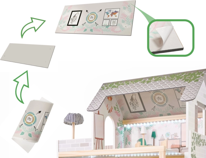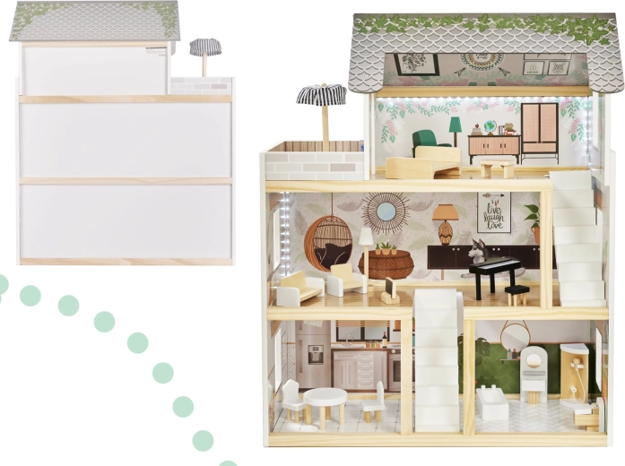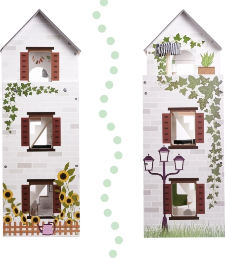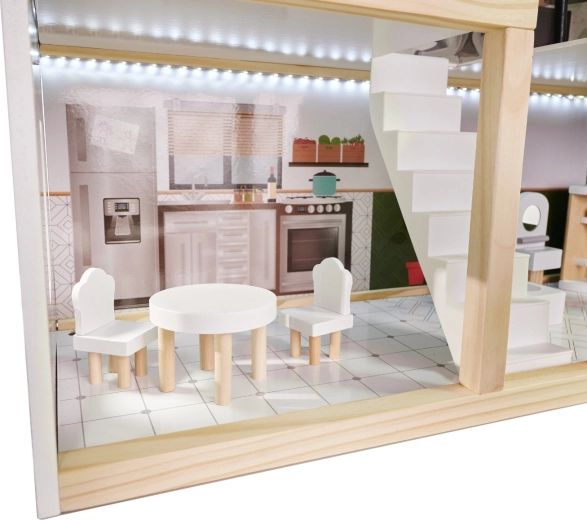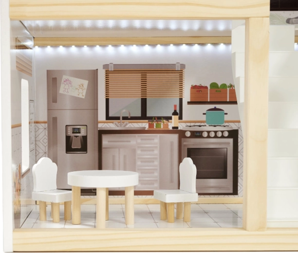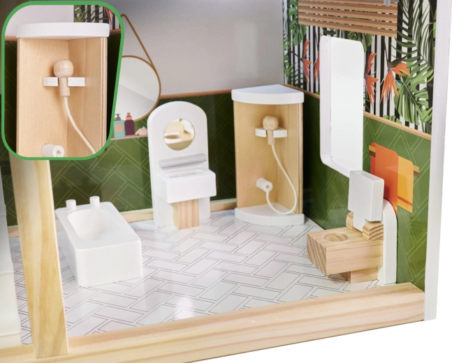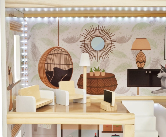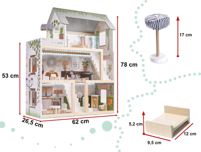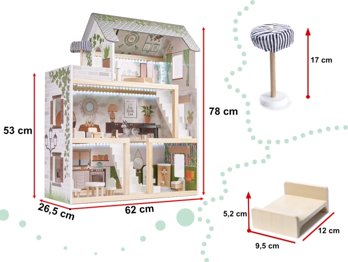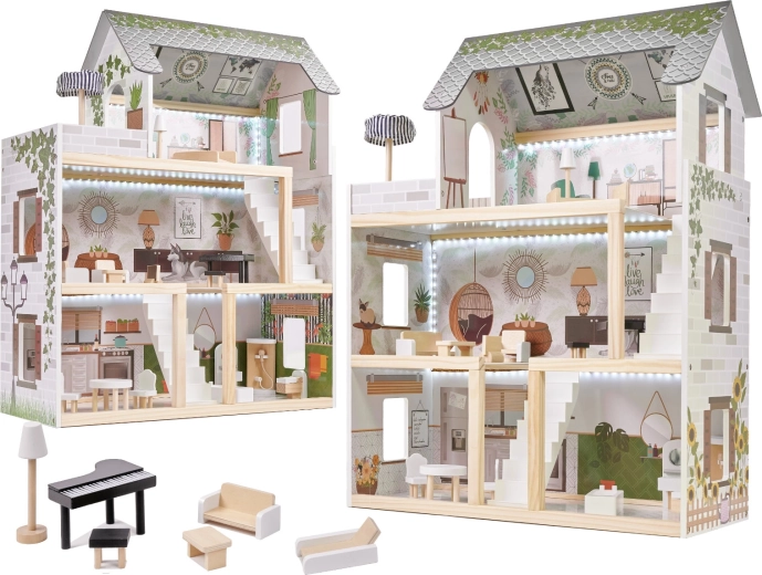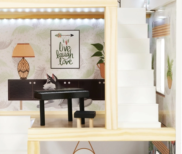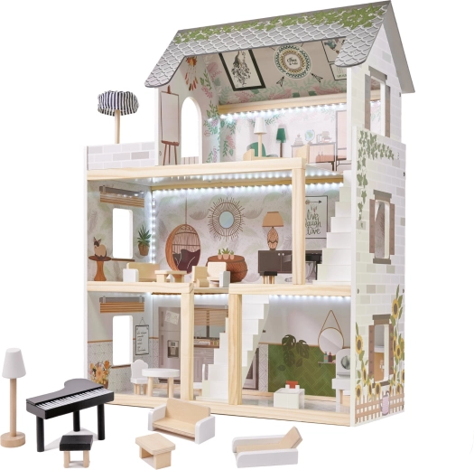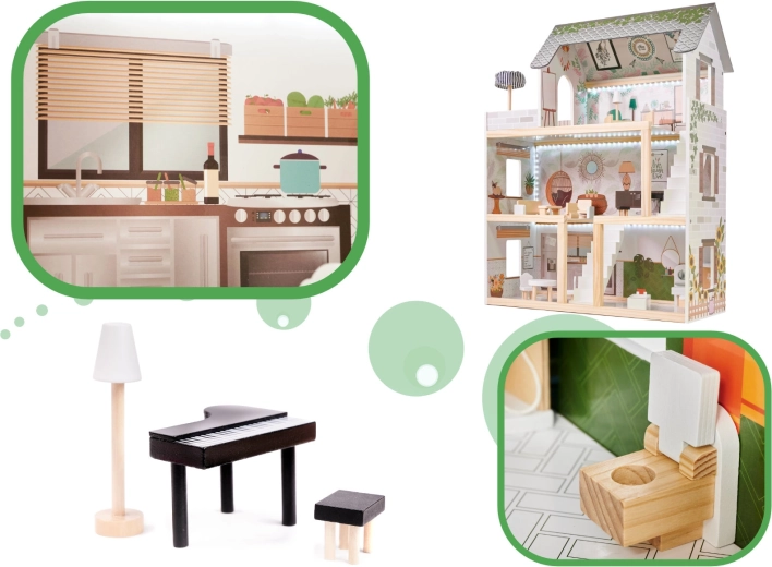 La maison de poupées en bois LULILO Floro est conçue dans un style bohème, ce qui la rend non seulement belle mais aussi fonctionnelle. Avec ses trois étages et sa terrasse spacieuse, elle offre suffisamment d’espace pour divers scénarios et jeux. La maison est équipée de quatre pièces : cuisine, salle de bain, salon et chambre, chacune richement aménagée comme dans une vraie maison.