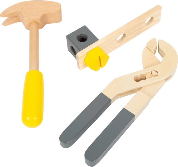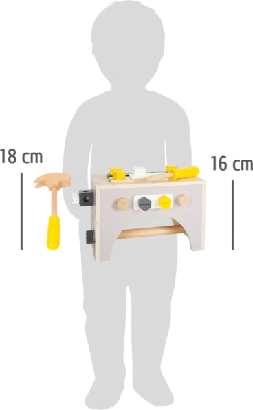 Marteau, clé, tournevis, pince étau et étau – le tout en bois robuste. Les enfants s’initient de manière ludique aux compétences « artisanales » de base.