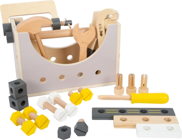 Le set comprend 5 outils en bois – marteau, clé, tournevis, pince étau et étau – ainsi que de nombreux éléments pour des projets créatifs. La poignée amovible et les ouvertures pratiques permettent de tout ranger rapidement, ce qui rend la caisse idéale pour les voyages.