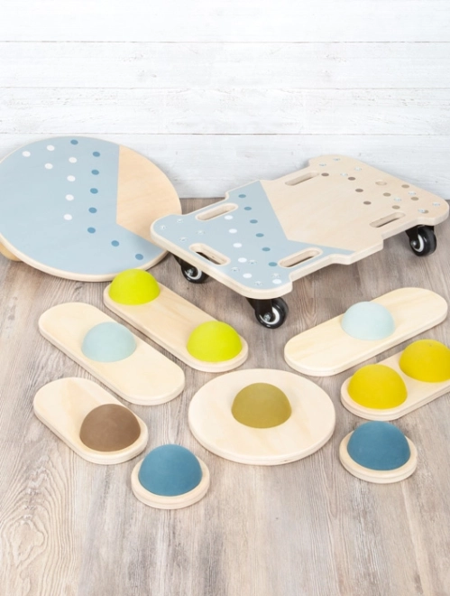 Pierres d'équilibre réversibles de la marque petit pied en bois massif avec hémisphères en mousse résistante aident les enfants à développer l'équilibre et la coordination. Elles encouragent de manière ludique la confiance en leurs propres capacités.