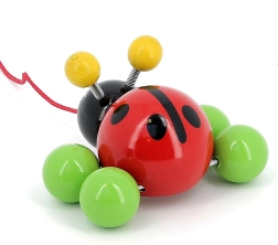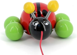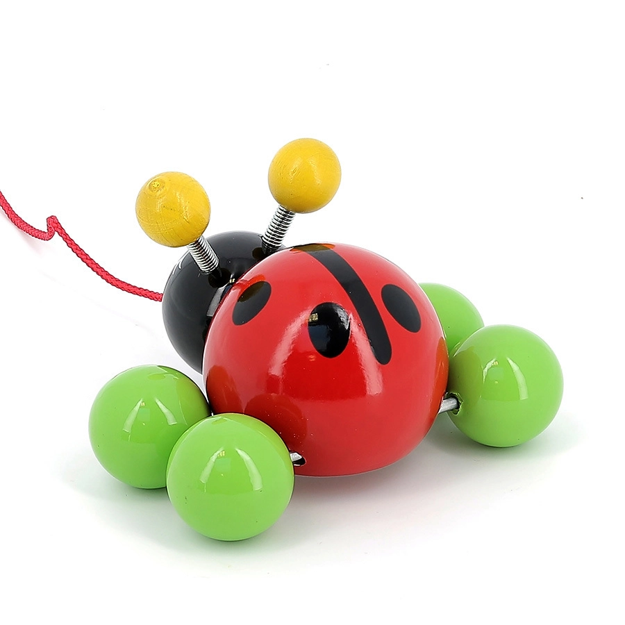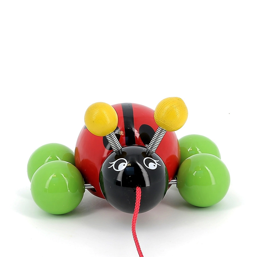 Cette coccinelle classique à tirer en bois laqué séduit par son design coloré, sa surface lisse et ses antennes souples qui se balancent gaiement lorsqu’on la tire. Grâce aux roues arrondies, la conduite est fluide et les enfants entraînent naturellement la coordination des pas et la confiance en marche.