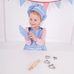 Les jeunes chefs adoreront cet ensemble en coton bleu lumineux et attrayant pour la cuisson et la cuisine. Il comprend un tablier, une manique, une toque de chef, un rouleau à pâtisserie et des emporte-pièces, idéal pour des activités culinaires amusantes et des jeux de rôle.
