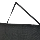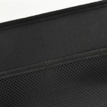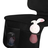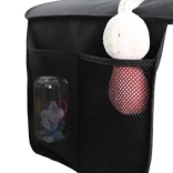Le tapis s'attache facilement grâce à des sangles élastiques qui se fixent à l'appui-tête. Il comprend également deux poches en filet qui facilitent le rangement de petits objets comme des jouets ou des bouteilles. Ces poches sont pratiques et permettent un accès rapide aux objets stockés.