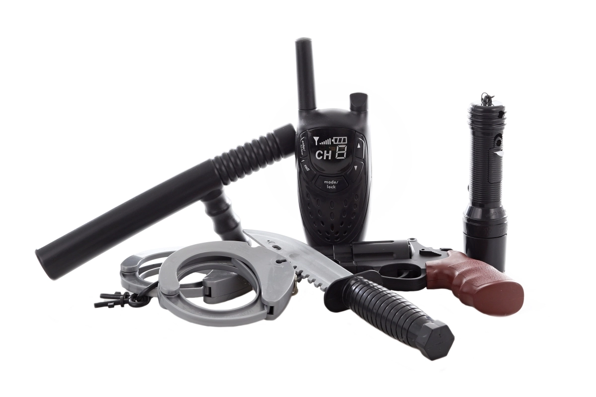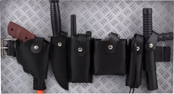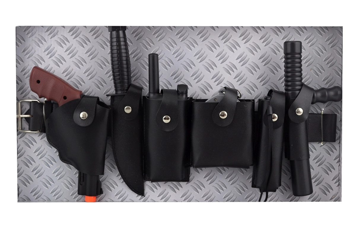 - Ceinture en cuir (env. 43 cm), pistolet, couteau, talkie-walkie, menottes, lampe de poche à piles, matraque