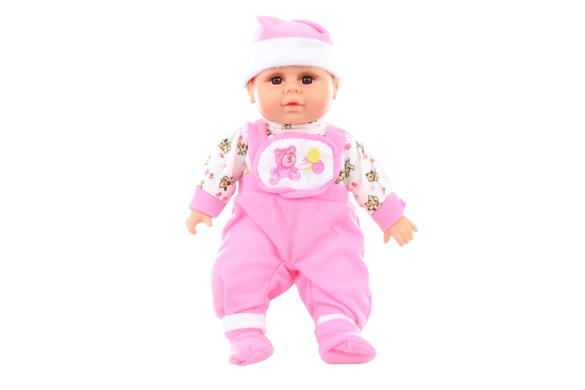 En pressant le corps, le poupon émet des rires, des pleurs et dit « maman », « papa », ce qui stimule l’imitation et l’imagination.