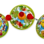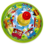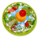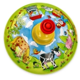 La toupie est ornée d’illustrations joyeuses représentant des animaux et des scènes de ferme, ce qui rend le jouet attrayant pour les jeunes enfants.