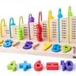 L'abacus se compose d'une base en bois avec des guides métalliques où se trouvent des billes en plastique colorées. Le tableau au centre propose des tâches d'addition d'un côté et de soustraction de l'autre. L'ensemble comprend également des blocs colorés amovibles avec des chiffres et des symboles +, - et =.