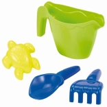Camion avec une longueur de 33 cm comprenant un arrosoir, un râteau, une petite pelle et un moule pour le sable, idéal pour les jeux d'enfants en plein air.