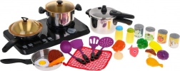 | Izvrsno opremljen kuhinjski set koji se sastoji od indukcijske ploče, lonaca i pribora za kuhanje, namijenjen djeci od tri godine. Tava, lonac i ekspres lonac izgledaju kao pravi, ali u minijaturnom izdanju. Indukcijska ploča napaja se s 3 AA 1,5 V baterije (nisu uključene) i opremljena je zvučnim i svjetlosnim efektima. S lijeve strane nalazi se osvijetljeni plamenik sa zvukovima kuhanja i panelom za promjenu vremena kuhanja od 2 do 20 minuta. S desne strane je osvijetljeni plamenik sa zvukovima prženja i gumbom za uključivanje/isključivanje. U kompletu se nalaze i makete hrane. | ||