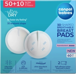 Jednokratne prsne uloške Canpol babies s 3D anatomskim oblikom idealne su za trudnice i dojilje. Nude ultraapsorbirajuću jezgru, prozračan i mekan gornji sloj te nepropusnu donju barijeru koja štiti rublje od promočivanja. Zahvaljujući 2 ljepljive trake pouzdano stoje na mjestu, vrlo su tanke (1,3 mm), diskretne i pružaju brz osjećaj suhoće. Pakiranje sadrži 60 komada (50 + 10 gratis).
