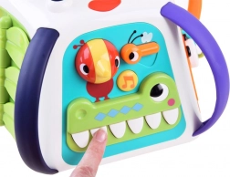 Nakon uključivanja kocka pokreće melodije, zvučne efekte i svjetlosne elemente koji djecu motiviraju na daljnje istraživanje. Ne nedostaje pianino u obliku krokodilskih zubi, pokretni elementi, klizni paneli s optičkim efektom “živih” animacija niti sigurno zrcalce.