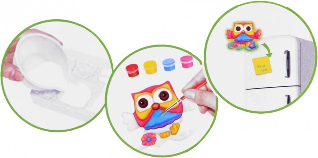 Otkrijte zabavan kreativni set za djecu s kojim mogu izraditi i obojiti vlastite magnetiće u obliku sova. Set potiče finu motoriku, kreativnost i maštu – od izlijevanja gipsa do bojanja i lijepljenja magnetske trake. Izradite do 6 preslatkih magnetskih sova za hladnjak, oglasnu ploču ili bilo koju metalnu površinu.