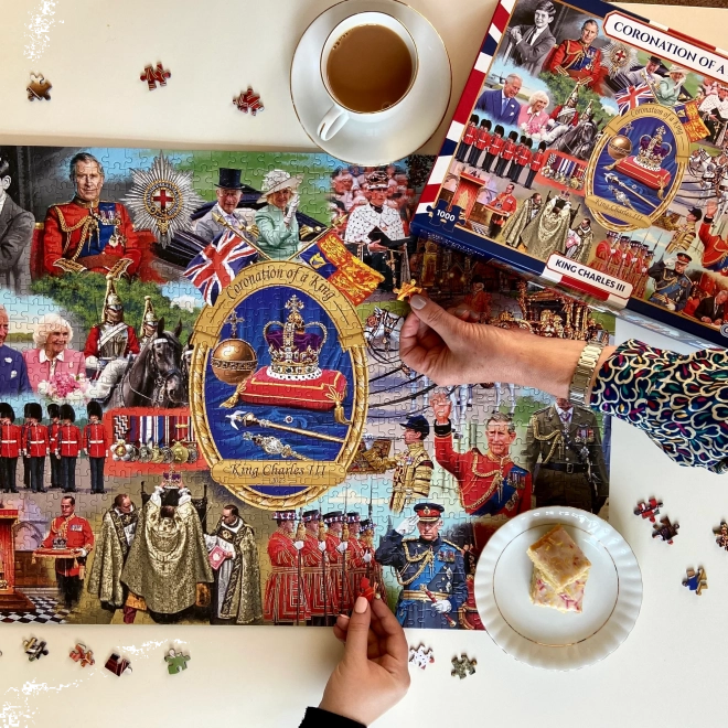 Puzzle Krunidba kralja prekrasna je slagalica sastavljena od 1000 dijelova koja oživljava povijesni trenutak izravno u vašoj dnevnoj sobi. Idealno za ljubitelje povijesti i slagalica!
