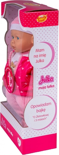 Lutka Julka uživa kada se o njoj brinete i vodite je u šetnju. Mekana lutka odjevena je u kapu, šal, kombinezon s prugastim hlačama i ružičastu prošivenu jaknu s kapuljačom obrubljenom prugastom tkaninom u boji hlača.
