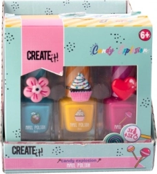 Ovaj razigrani set lakova za nokte CREATE IT! donosi djeci svijet boja i mašte. Tri upečatljive nijanse (tirkizna, žuta, ružičasta) lako se nanose, a zahvaljujući malom kistiću odlične su za sitne noktiće. Svaki lak nadopunjuje tematski prsten koji se slaže s motivom bočice – još više veseli kao dodatak gotovoj manikuri.