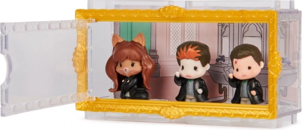 3 figurice (Harry Potter, Hermione Granger, Ron Weasley) + 3 postolja, transparentna kutija s dvostranom pozadinom
