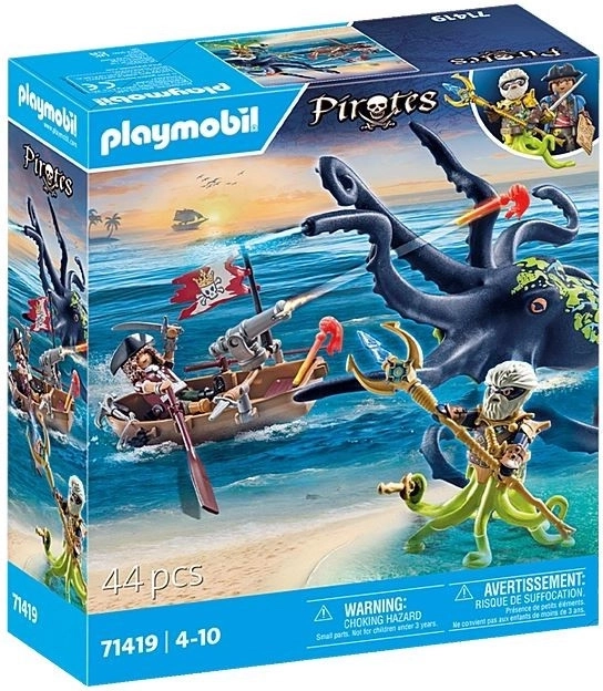 Gigantska hobotnica s vođom Deepera, napola čovjekom napola hobotnicom, upravlja moćnim trozupcem s čarobnim kompasom i juri za gusarom u čamcu. Kad sustigne plijen, špricne vodu iz svojih krakova i gusar ima pune ruke posla! Set PLAYMOBIL Pirates nudi sate zabave i priča iz gusarskog svijeta.