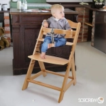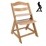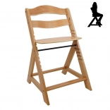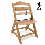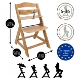 Drvena rastuća stolica za blagovaonicu dizajnirana je za maksimalnu udobnost i sigurnost djece od šest mjeseci. Opremljena je višestupanjskim podešavanjem visine sjedala i oslonca za noge, tako da može služiti od ranog djetinjstva pa sve do odrasle dobi. Kod starije dobi, prednja prečka i podijeljeni razmak između prepona mogu se ukloniti, a stolica se može pretvoriti u običnu stolicu. Izrađena je od visokokvalitetne njemačke bukovine i pruža stabilnost i eleganciju. Njena maksimalna nosivost je do 90 kg.