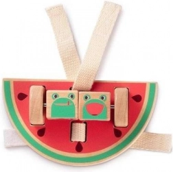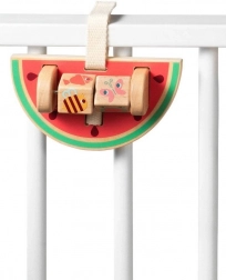 Šarena igračka u obliku lubenice, opremljena metalnom šipkom s okretnim kockicama, nudi zabavu i podržava razvoj fine motorike kod djece.