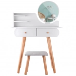Toaletni stolić opremljen s dvije prostrane ladice, okruglim zrcalom, velikom pločom i mekom stoličicom presvučenom svijetlo bež materijalom svidjet će se gotovo svakoj djevojci. Namještaj je dovoljno velik da maloj toaletnoj konzoli služi dugi niz godina. Prostrane ladice lako će primiti nakit, kozmetiku, kopče, gumice za kosu itd. Većina malih djevojčica voli oponašati svoje mame, bake, sestre, a s ovakvim profesionalnim toaletnim stolićem mala elegantna djevojka moći će se osjećati posebno.