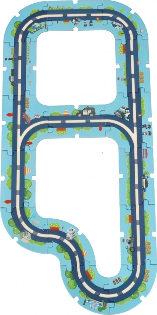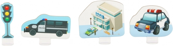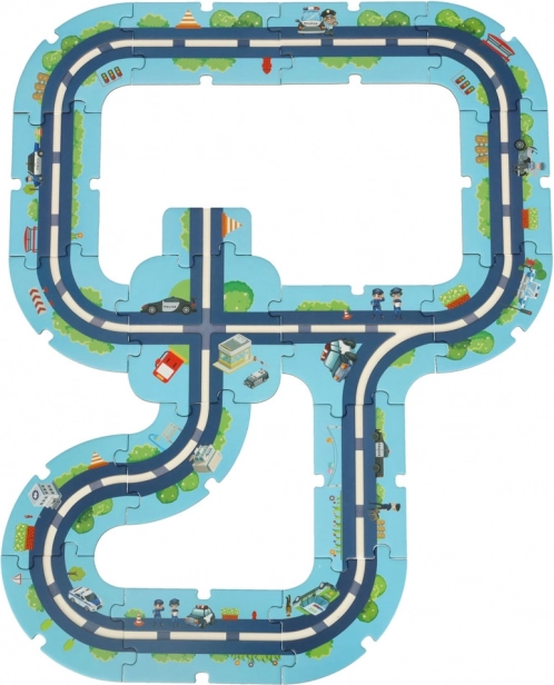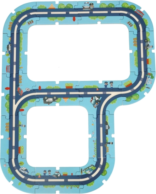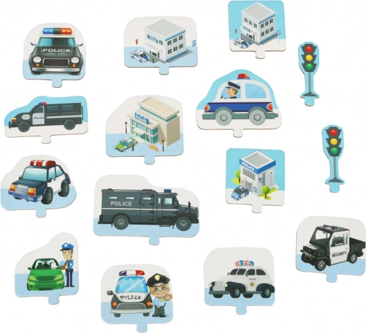 Ova jedinstvena slagalica vašoj će djeci omogućiti da izgrade vlastiti policijski grad. 38 puzzli omogućuje stvaranje vlastite mreže zavojitih ulica po kojima se djeca mogu voziti policijskim vozilima i nadzirati red. Set sadrži i posebne dijelove koji se mogu slobodno postaviti na podloge i tako stvarati nove infrastrukturne elemente.