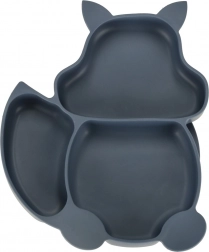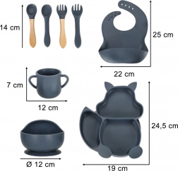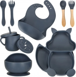 Kompletan silikonski set za hranjenje od 9 dijelova za djecu s motivom vjeverice u tamnoplavoj boji. Sadrži podijeljeni tanjur, zdjelicu s prijanjalicom, šalicu s dva poklopca i slamkom, podbradnik i mekani pribor za jelo. Je bez BPA, izdržljiv i lako se čisti u perilici posuđa – idealan za početke samostalnog hranjenja s protukliznim prijanjalicama.