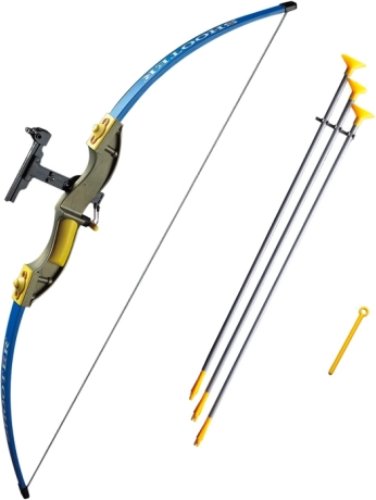 Set sadrži impresivni luk koji mjeri 102 cm u dužinu i izrađen je u atraktivnoj plavoj boji s žutim i zlatnim dodacima. Tri strijele u sivo-žutoj kombinaciji boja su završene gumenim vakuumom, što osigurava sigurnu upotrebu i minimizira rizik od ozljeda.