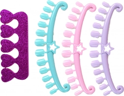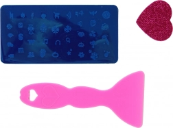 - Ružičasti svjetlucavi koferčić s ogledalom, 4 laka za nokte u boji, razdjelnik za prste, rašpica, pečat, pločica za pečatiranje s uzorcima, strugalica/špatula, 3 šablone za tipse, naljepnice za tipse, samoljepljive naljepnice i kamenčići, mali spremnik