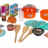 - konstruktivni dijelovi kuhinjice, lonac s poklopcem, tava, šalica, 4× tanjur, pribor za jelo (nož, vilica, žlica), kutlača, lopatice (uključujući 3× veliku), sjeckalica, kliješta, zdjelica, namirnice (bundeva, salata, rak, piletina, 2× jaje na oko, grožđe, riba, hrenovke, kečap, kutijice s keksima, mlijekom i sladoledom, čokoladno mlijeko, instant juha), jelovnik, krpica, pipeta za vodu, dekorativne naljepnice