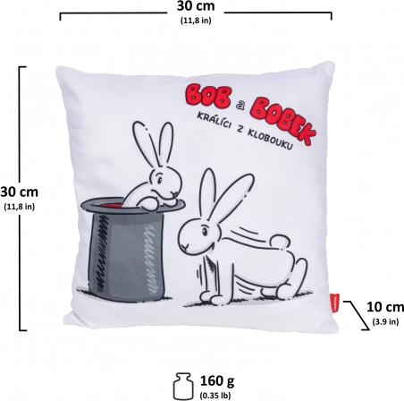 Dječji jastuk BOB I BOBEK 30 × 30 cm razveselit će sve ljubitelje legendarnih zečeva iz šešira. Mekani mikrovelur nježan je prema dječjoj koži, visokokvalitetni tisak s motivom “vježba” dugo zadržava boje, a punjenje od šupljeg vlakna je lagano i dobro drži oblik.