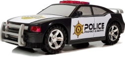 Crno-bijela patrola s rotacijskim svjetlom, oznakama i odbojnikom za akcijske potjere. Idealno za uloge i učenje sigurnosnih pravila kroz igru.
