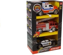 Ovaj set spasilačkih vozila oduševit će sve male ljubitelje akcije i uzbuđenja. U pakiranju se nalaze policijski auto, vatrogasno vozilo i hitna pomoć – svaki model ima izražajne boje, tipične natpise i elemente koji djeci lako približavaju rad stvarnih žurnih službi. Pritiskom na tipke uključuju se crvena svjetla i oglašavaju sirene i truba, što igru čini još realističnijom.