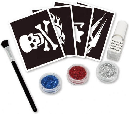 - kist; 4 šablone (mogu se koristiti više puta); ljepilo za tetovaže; šljokice u 3 boje; upute