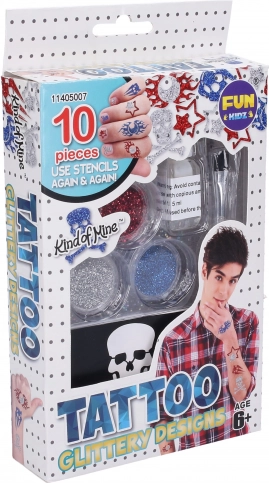 Izradi vlastite originalne dizajne s ovim setom za privremene šljokičaste tetovaže za dječake. Sadrži 4 višekratne šablone, 3 boje šljokica, ljepilo, kist i upute – jednostavna zabava za djecu od 6+.