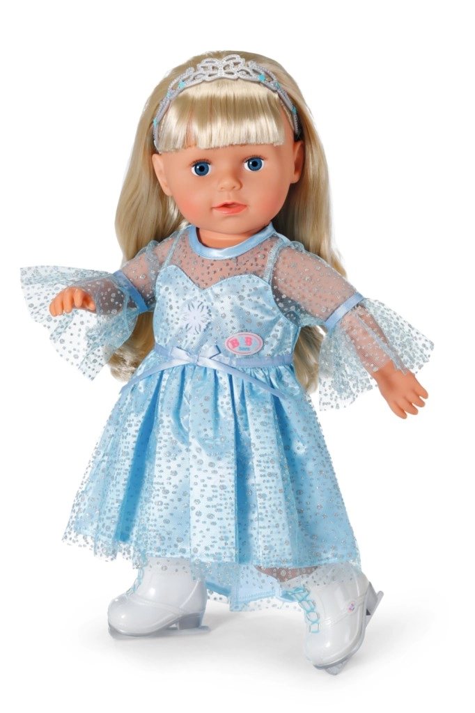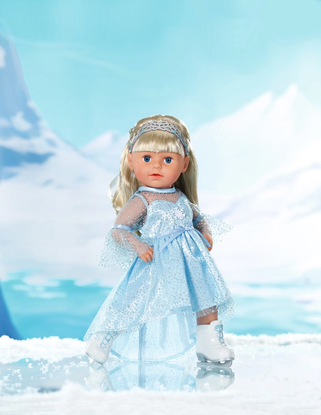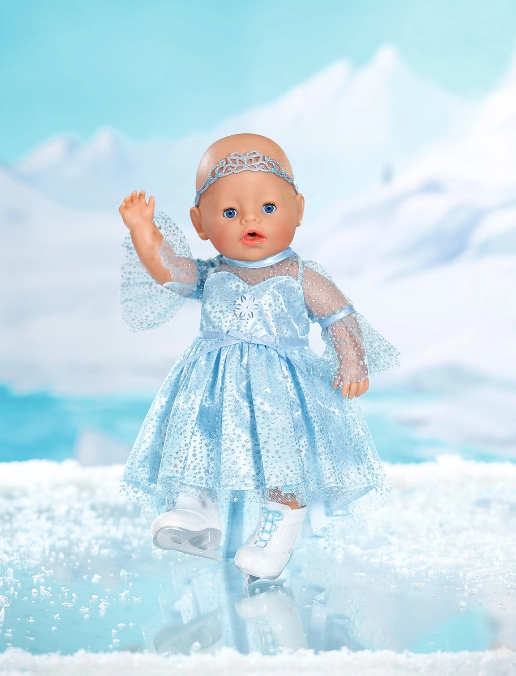 Elegantan set za BABY born lutke 43 cm donosi čaroliju zimskog kraljevstva u svakodnevnu igru. Lagané sjajne haljine s nježnim prekrivačem lako se oblače, a zahvaljujući dijademu frizura će držati i pri svakoj pirueti. Bijele cipele u stilu klizaljki potiču maštu i dječje priče o umjetničkom klizanju.
